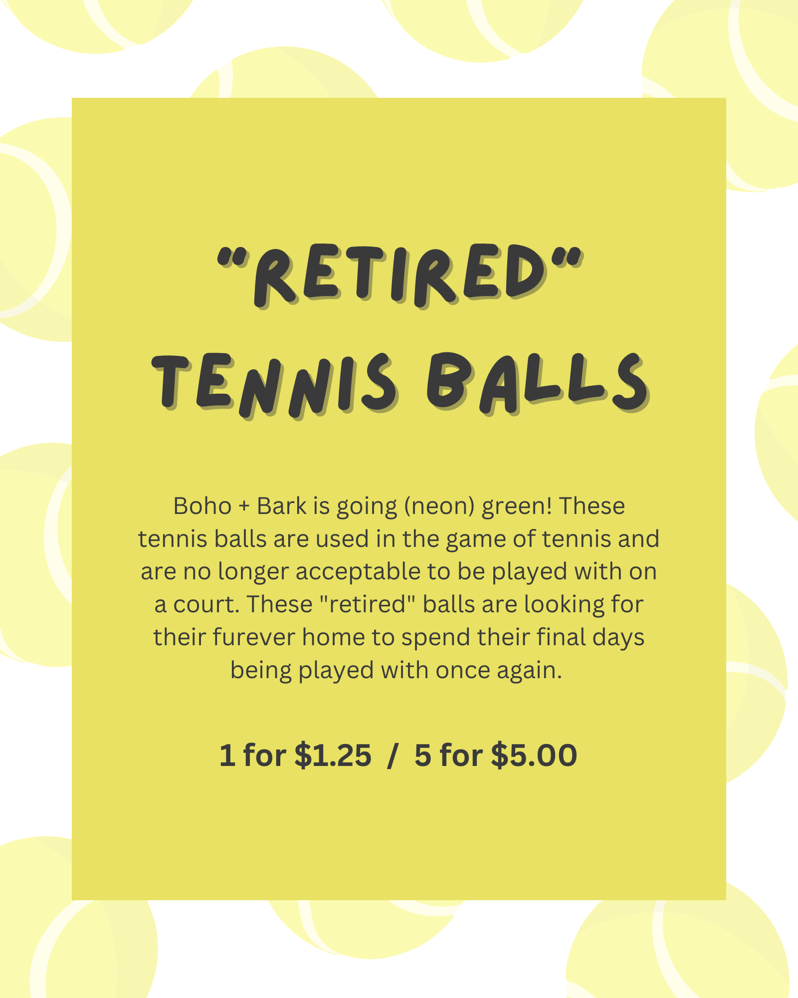 A new approach for spoiling your dog with their favorite toy. These tennis balls were used in the game of tennis and are no longer acceptable to be played with on a court. These "retired" balls are looking for their furever home to spend their final days being played with once again.