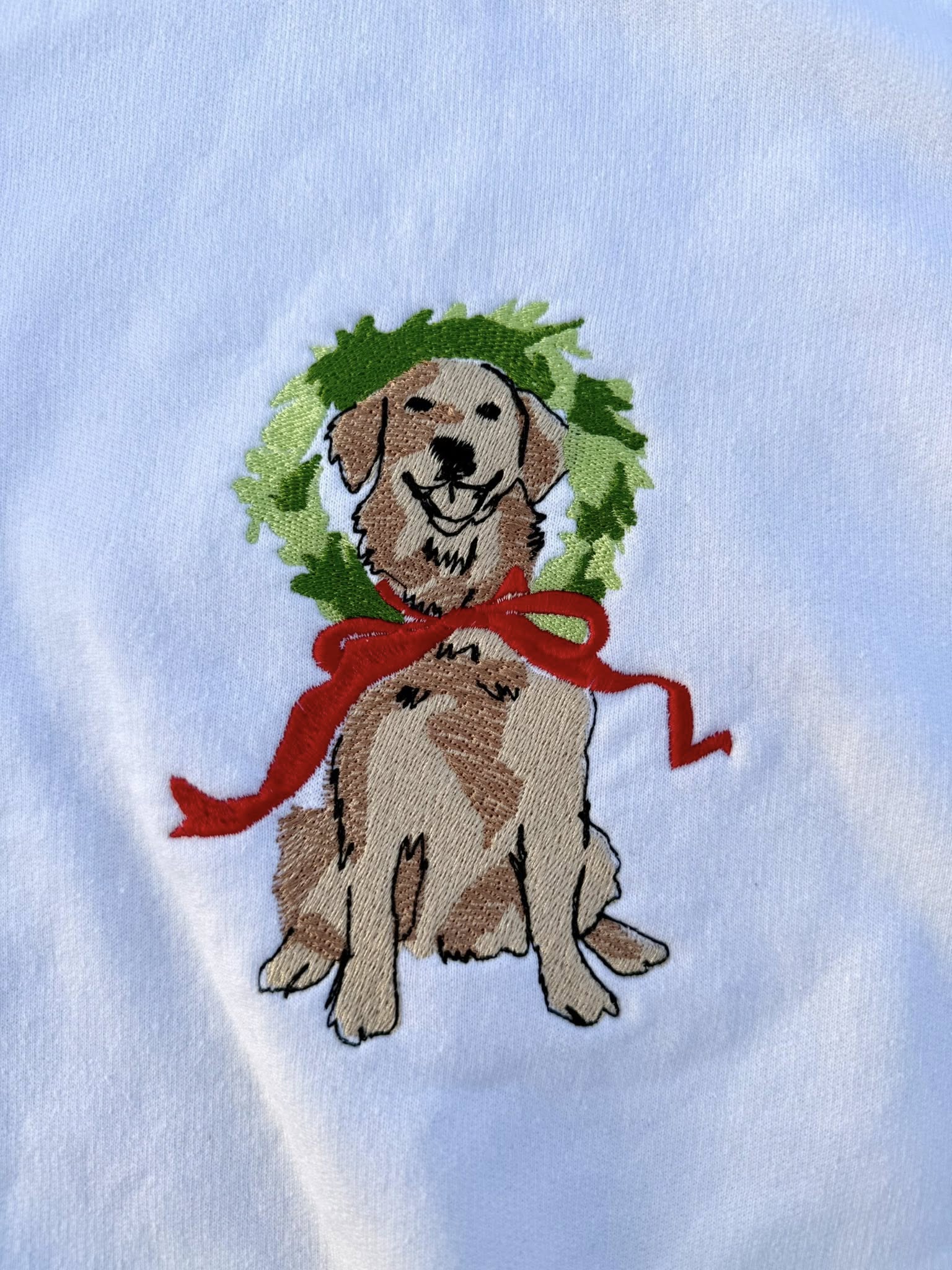 Celebrate the season with your favorite furry friend in this charming embroidered crewneck! Featuring an adorable Golden Retriever decked out in a christmas wreath, this cozy pullover brings festive cheer and golden pride together. Perfect for holiday gatherings, casual winter wear, or showing off your love for these lovable pups. Soft, comfortable, and guaranteed to spark smiles wherever you go.