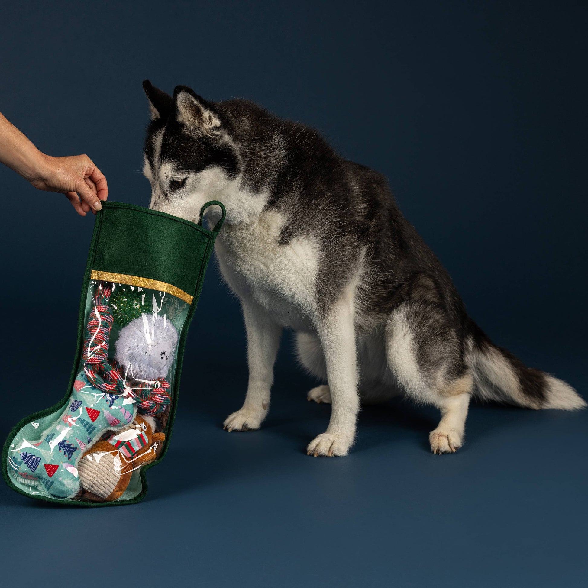 Snow what fun! PetShop by Fringe Studio's "Happy Pawlidays" dog toy stocking is here to celebrate the howl-idays. This set includes 5 holly jolly holiday toys: 3 plush toys with super loud squeakers and crinkle paper, a spiky TPR squeaky glitter ball, and a double fist monkey rope. Whether your pup likes to fetch, chew, or tug, this is the perfect gift that will have your pup barking in a winter wonderland! Great for all dog sizes and not intended for aggressive chewers. • 5 dog toys • 3 unique holiday plush toys with super loud squeakers & crinkle paper • Spiky TPR squeaky glitter ball • Double-fisted monkey rope • Perfect for all dog sizes • Stocking: 20" h x 11" w • Reindeer: 8.75" h x 5.5" w x 3" d • Bone: 5" h x 8" w x 2" d • Snowball: 4" h x 4.25" w x 3" d • Rope: 14" h x 5.5" w • Spiky TPR Ball: 2.75" h x 2.75" w