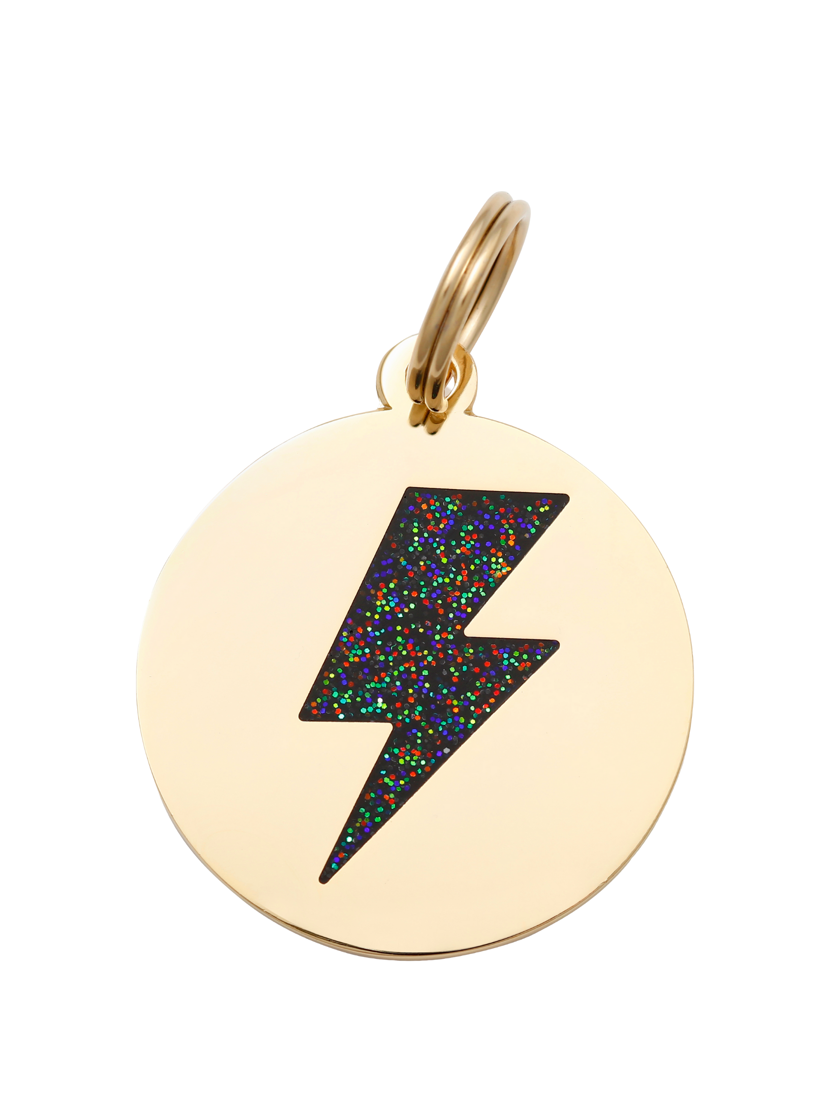 "Whether you dog is fast to run after the doorbell or still fast asleep when you walk in, sparks always fly when you see each other. The ‘Lightning Bolt’ Pet ID Tag shines with glitter so it’s always a striking to look. Available in black and white with gold or silver plating so your pup's style is always fresh. Add your dog's name for a pet ID tag! Can be customized with up to four lines of text on the backside.