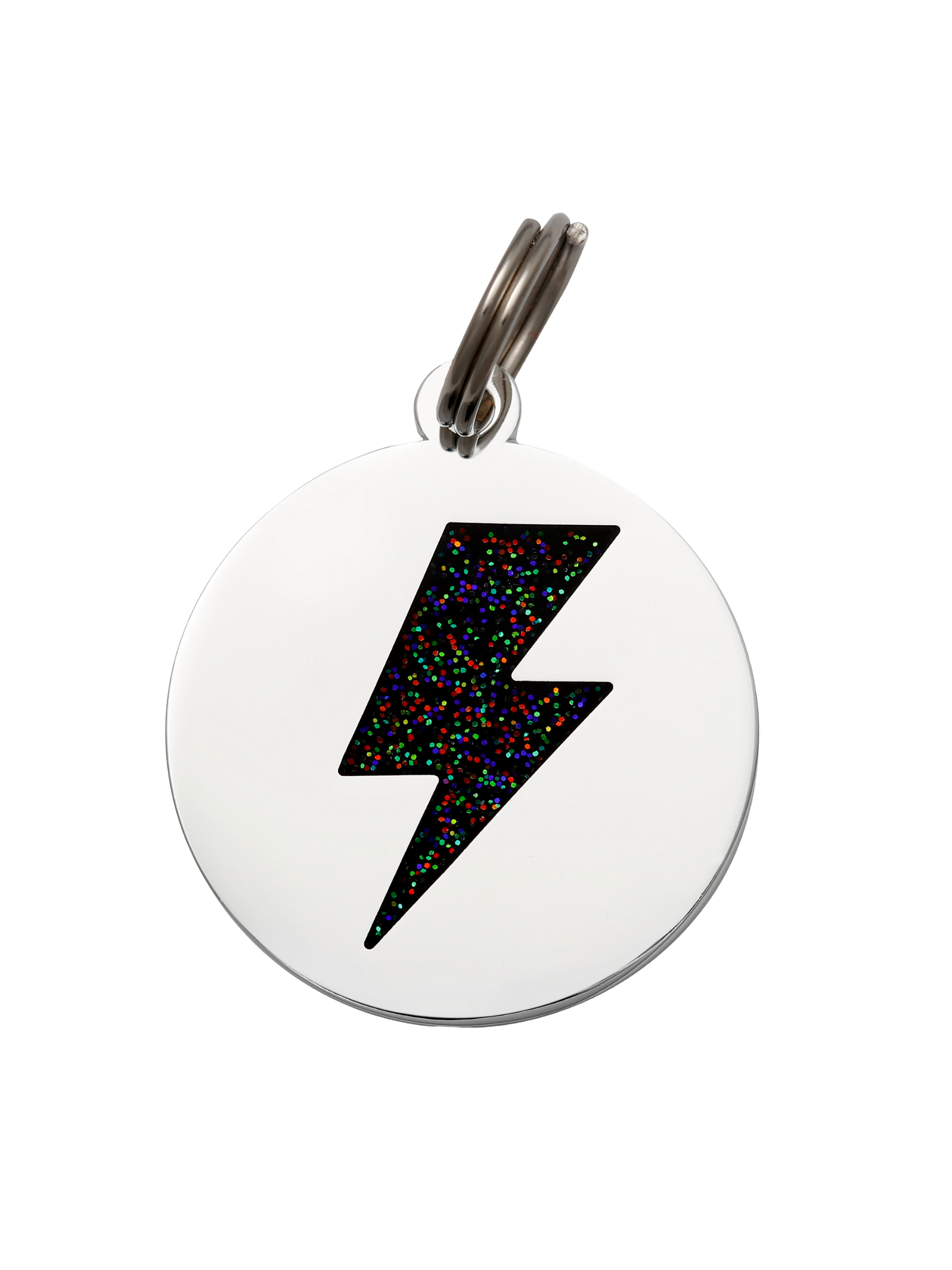 "Whether you dog is fast to run after the doorbell or still fast asleep when you walk in, sparks always fly when you see each other. The ‘Lightning Bolt’ Pet ID Tag shines with glitter so it’s always a striking to look. Available in black and white with gold or silver plating so your pup's style is always fresh. Add your dog's name for a pet ID tag! Can be customized with up to four lines of text on the backside.