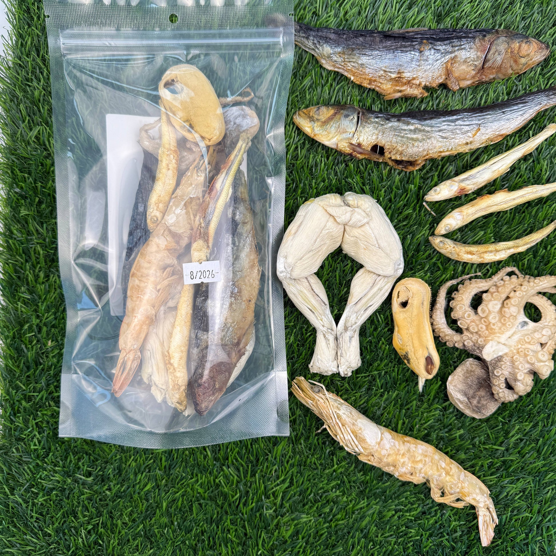 Neptune’s Nibbles Freeze-Dried Seafood Treats for Dogs & Cats | Wild-Caught, Raw Goodness Set sail on a tasty adventure with Neptune’s Nibbles, the ultimate freeze-dried treat bag for your dog or cat! Packed with the bounty of the sea (and a bit of land), these treats are perfect for pets with a taste for something extraordinary. Each nibble is made with high-quality, wild-caught seafood and freeze-dried raw to lock in all the natural flavors and nutrients. What’s in the Bag? * 1 Frog Leg * 2 Wild-Caught Sardines (5-6 inches) * 1 Wild-Caught Shrimp * 1 Wild-Caught Baby Octopus * 3 Wild-Caught Smelt Your pet will love sinking their teeth into these tasty bites, made from nothing but the good stuff—no fillers, no preservatives, just pure, single-ingredient treats that make every snack time feel like a trip to the ocean! Storage/Shelf: * Shelf life: At least 1 year. * No refrigeration needed. * Store in a cool, dry place, away from sunlight and moisture