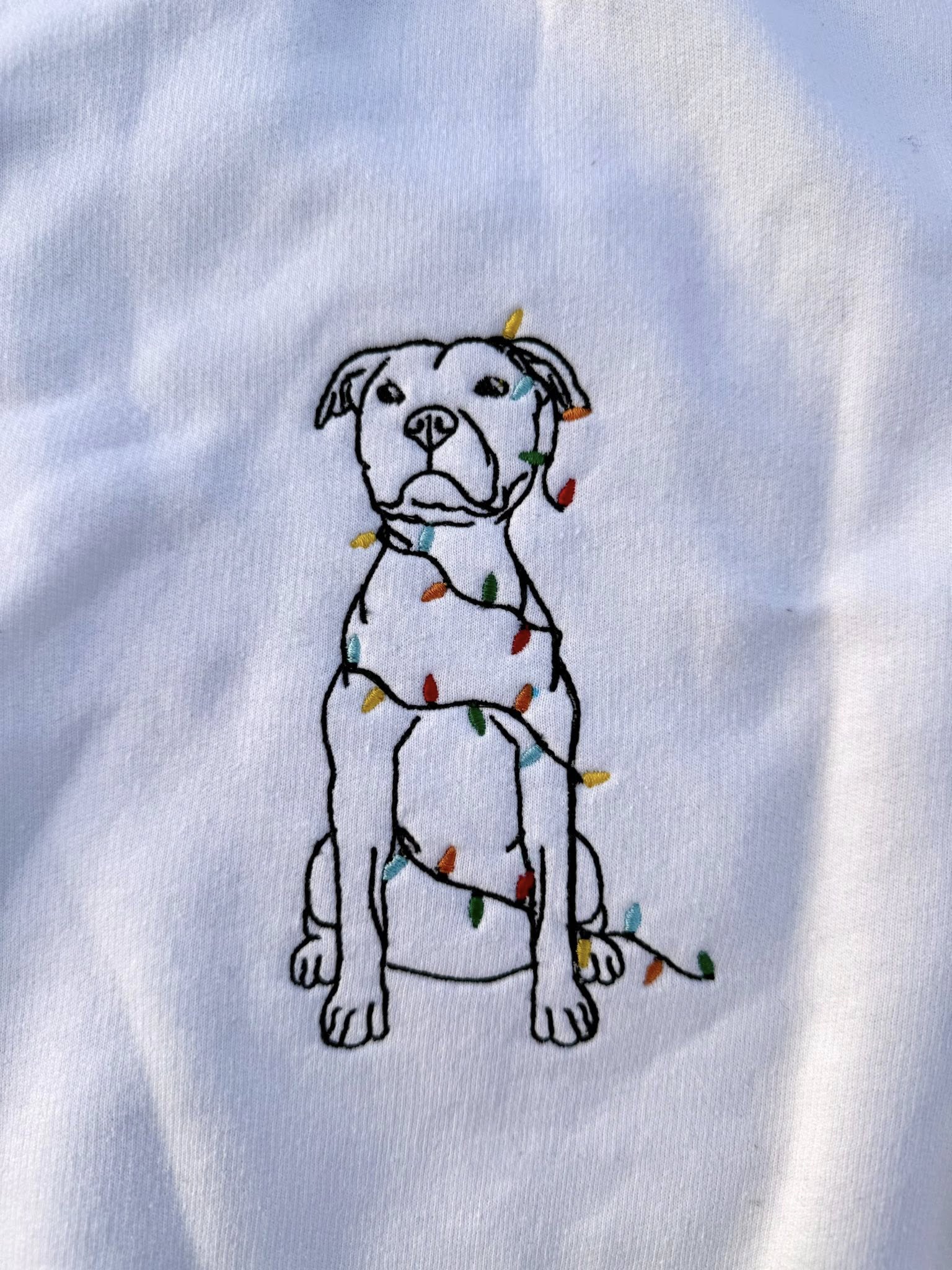 Celebrate the season with your favorite furry friend in this charming embroidered crewneck! Featuring an adorable pittbull decked out in twinkling Christmas lights, this cozy pullover brings festive cheer and pit bull pride together. Perfect for holiday gatherings, casual winter wear, or showing off your love for these lovable pups. Soft, comfortable, and guaranteed to spark smiles wherever you go.