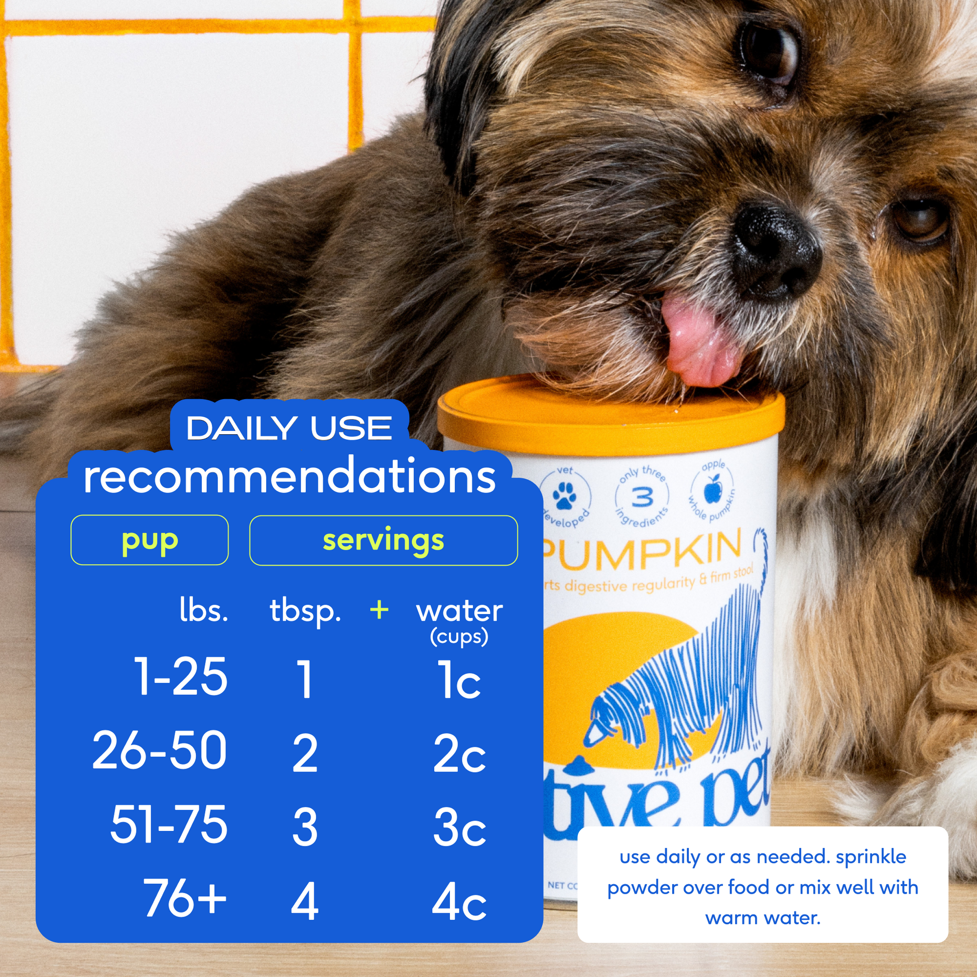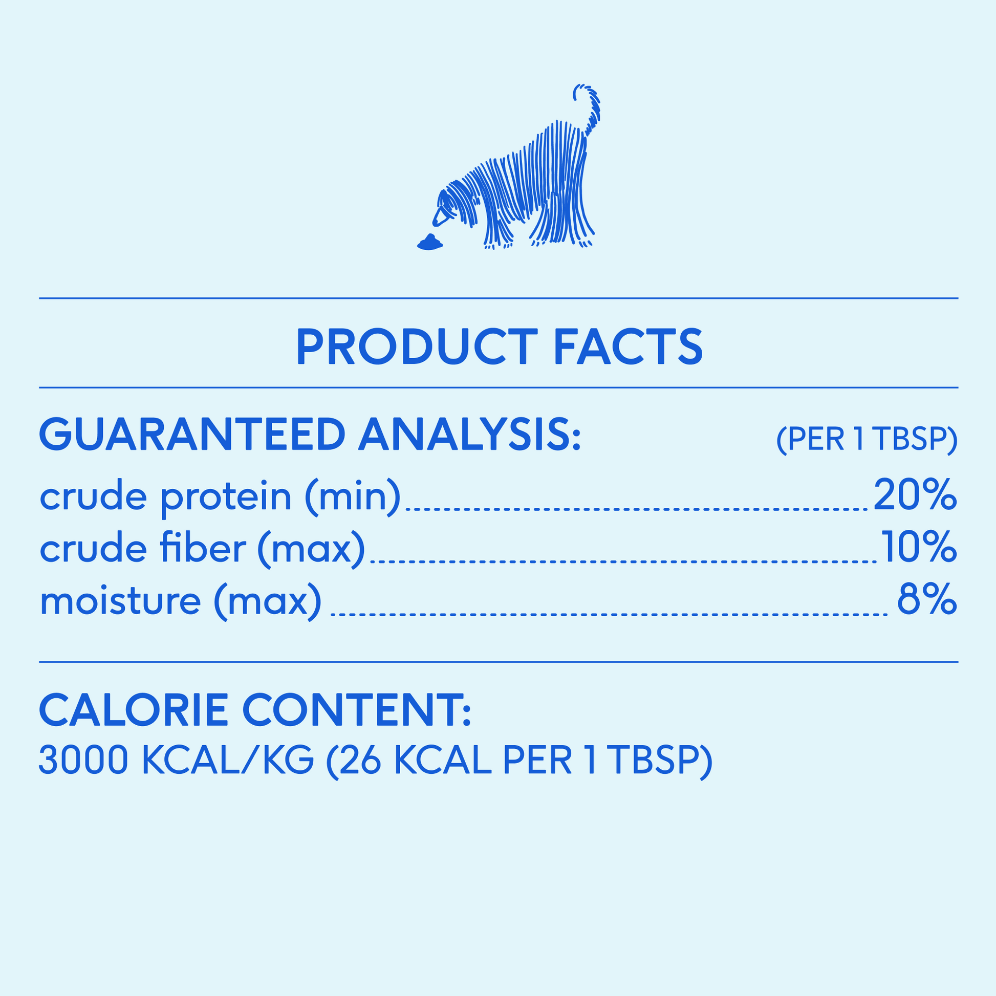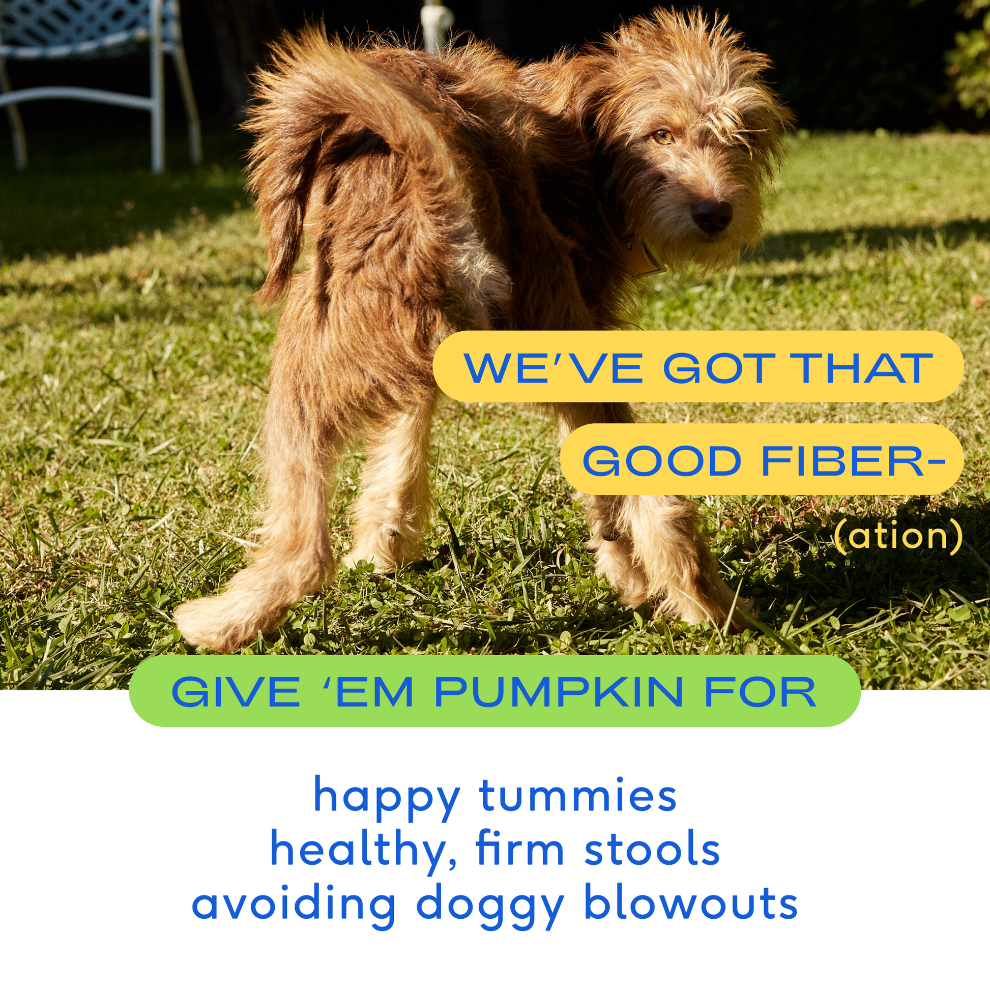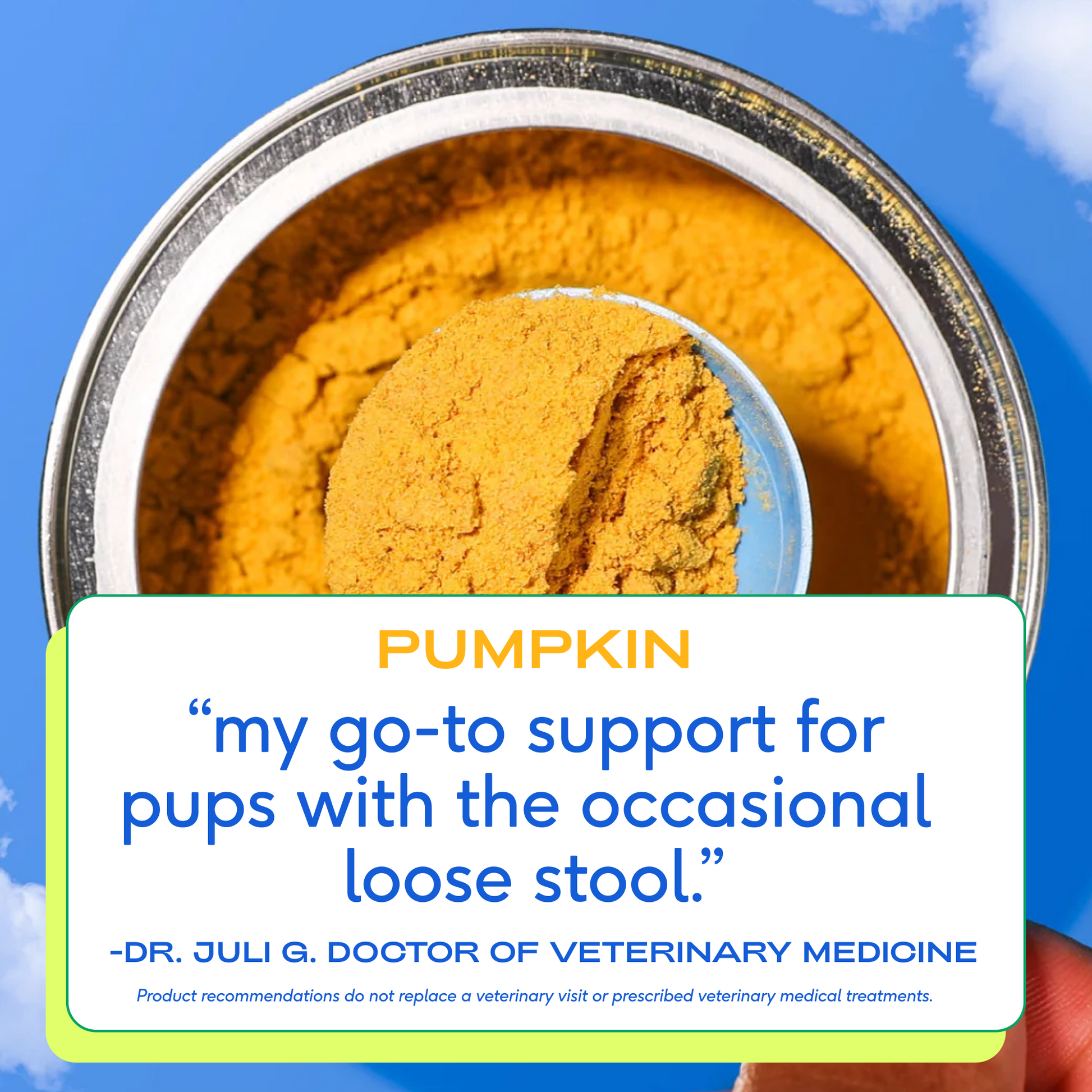 Our Pumpkin is anything but basic. Our tummy-regulating, Organic Pumpkin powder contains high-fiber pumpkin seed. Plus, it's formulated with the right fiber to protein ratio to support good gut health. That means your pup can say goodbye to diarrhea, loose stools, and tummy troubles with our full-of-fiber, vet-formulated recipe. Solid poops only, please!