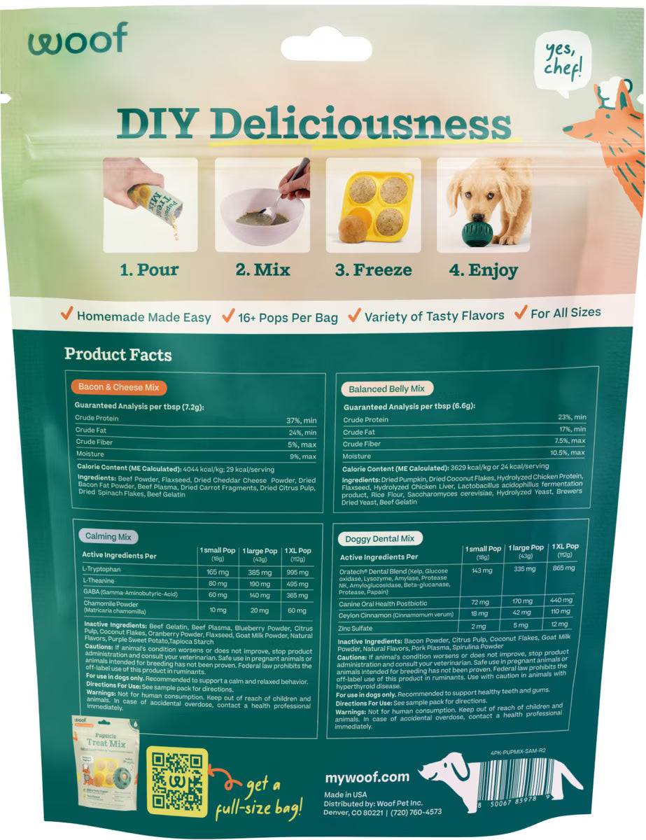 Introduce your pup to a world of delicious flavors with the Woof Pupsicle Mix Sample Pack Lickable Dog Treats. This sample pack includes four formulas: Bacon & Cheese, Calming, Balanced Belly, and Doggy Dental. Each flavor is uniquely designed to support specific needs, whether it’s picky eating, anxiety relief, digestive balance, or oral hygiene. Simply add water, pour into the Pupsicle Treat Tray (sold separately), and freeze to create tasty, long-lasting treats for your furry friend.