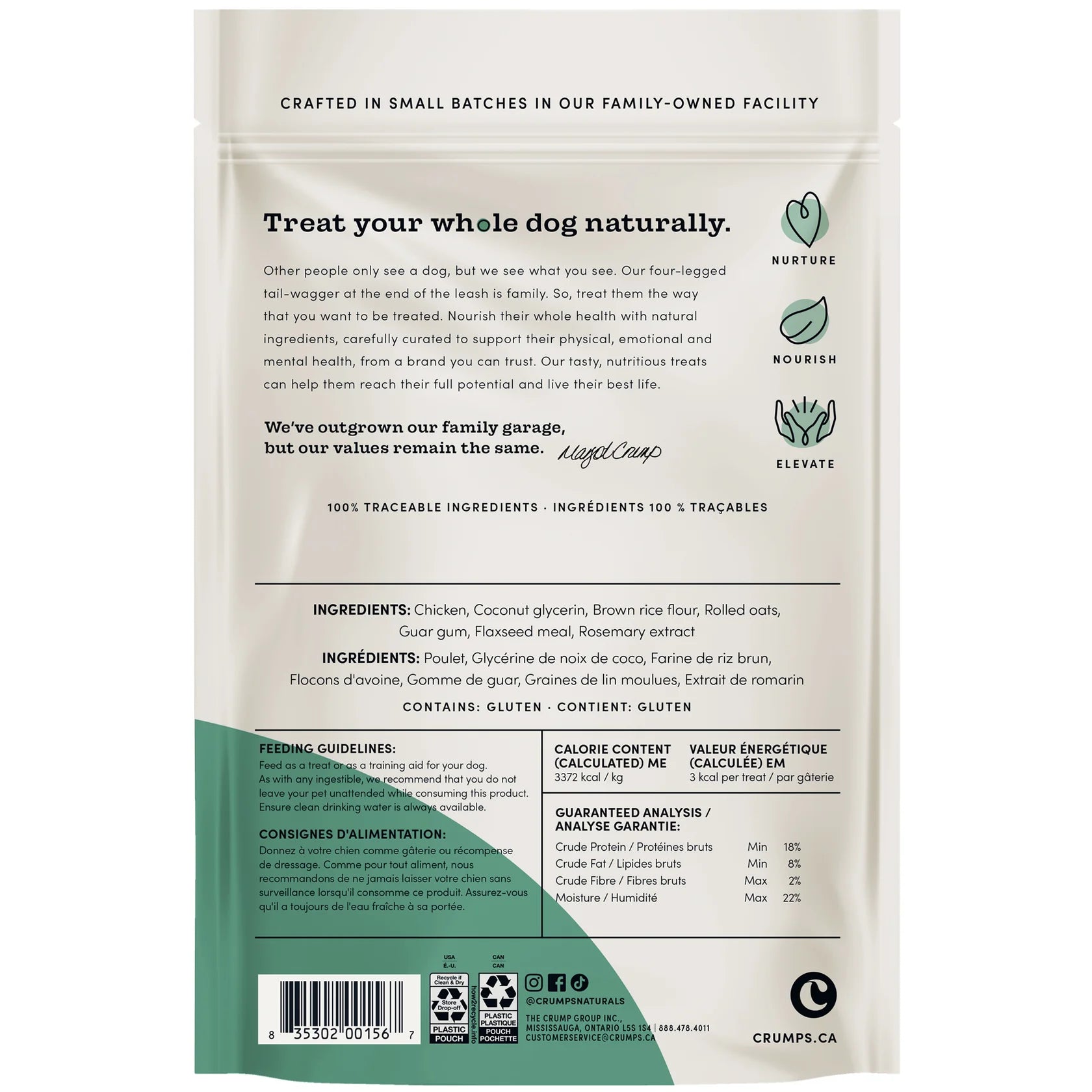 Each soft and chewy treat contains all natural ingredients starting with North American Chicken making it the perfect high protein snack for dogs of all ages and sizes.