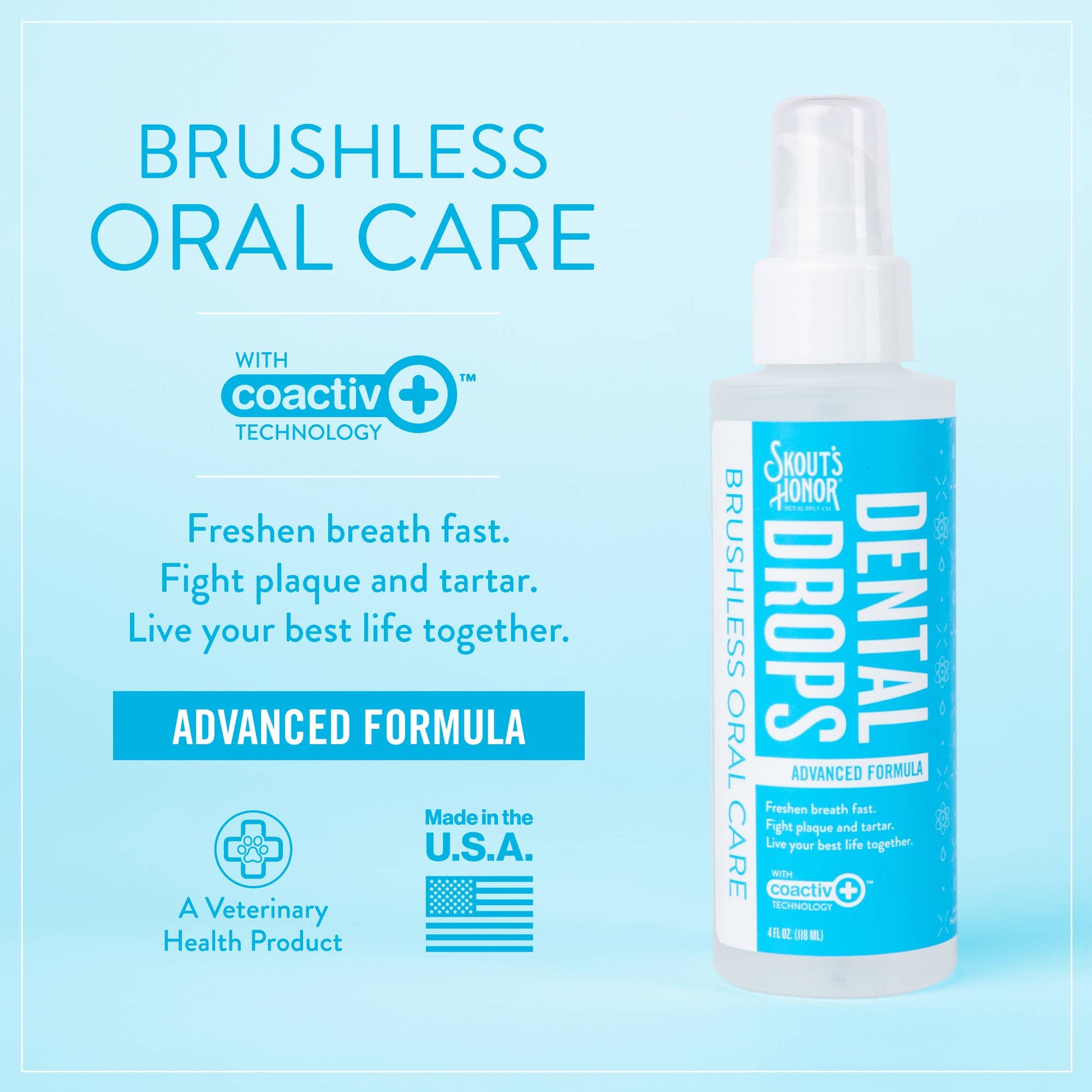 Skout’s Honor Dental Drops are proven to freshen breath fast, while helping to reduce plaque and tartar at the source. Advanced Formula for targeting specific problem areas. Spray-free pump makes it easy to apply, without startling sensitive pets. Odorless & flavorless. Freshen breath fast, fight plaque and tartar, and live your best life together with this advanced formula.