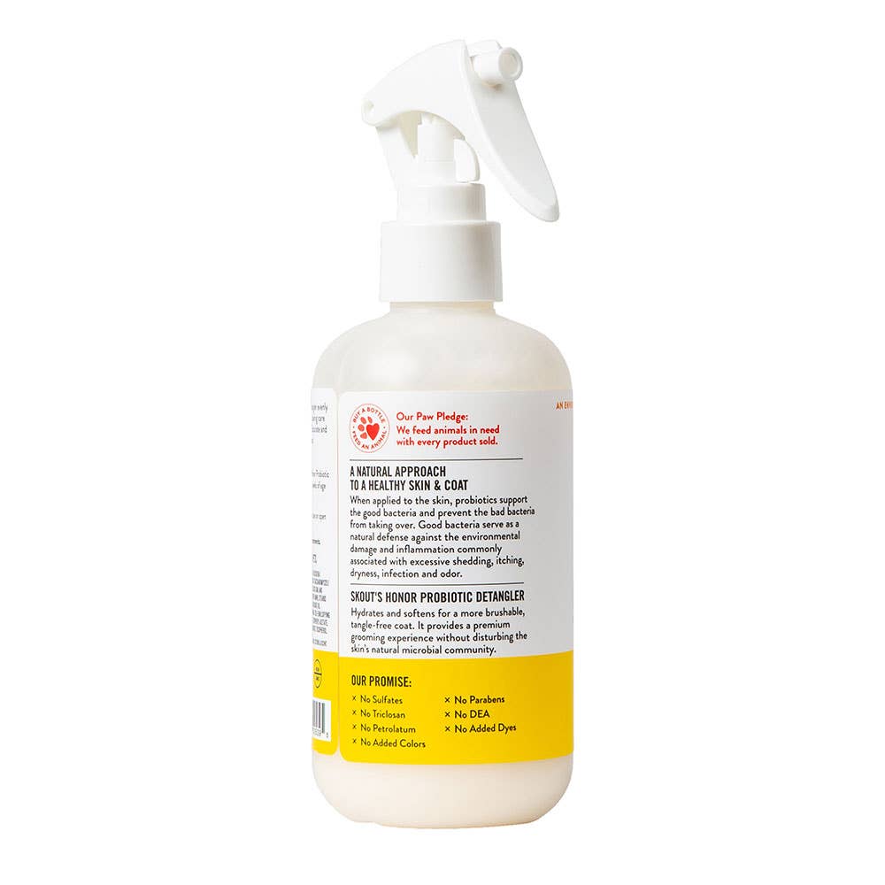 Our dog and cat hair detangler hydrates the skin and softens the coat for a more brushable, tangle-free pet. It contains avocado oil and live, topical probiotics that help support a healthy microbiome to defend against common skin problems such as itching, odor, dryness, dandruff, hot spots, and excessive shedding.