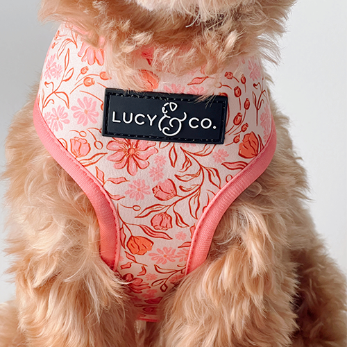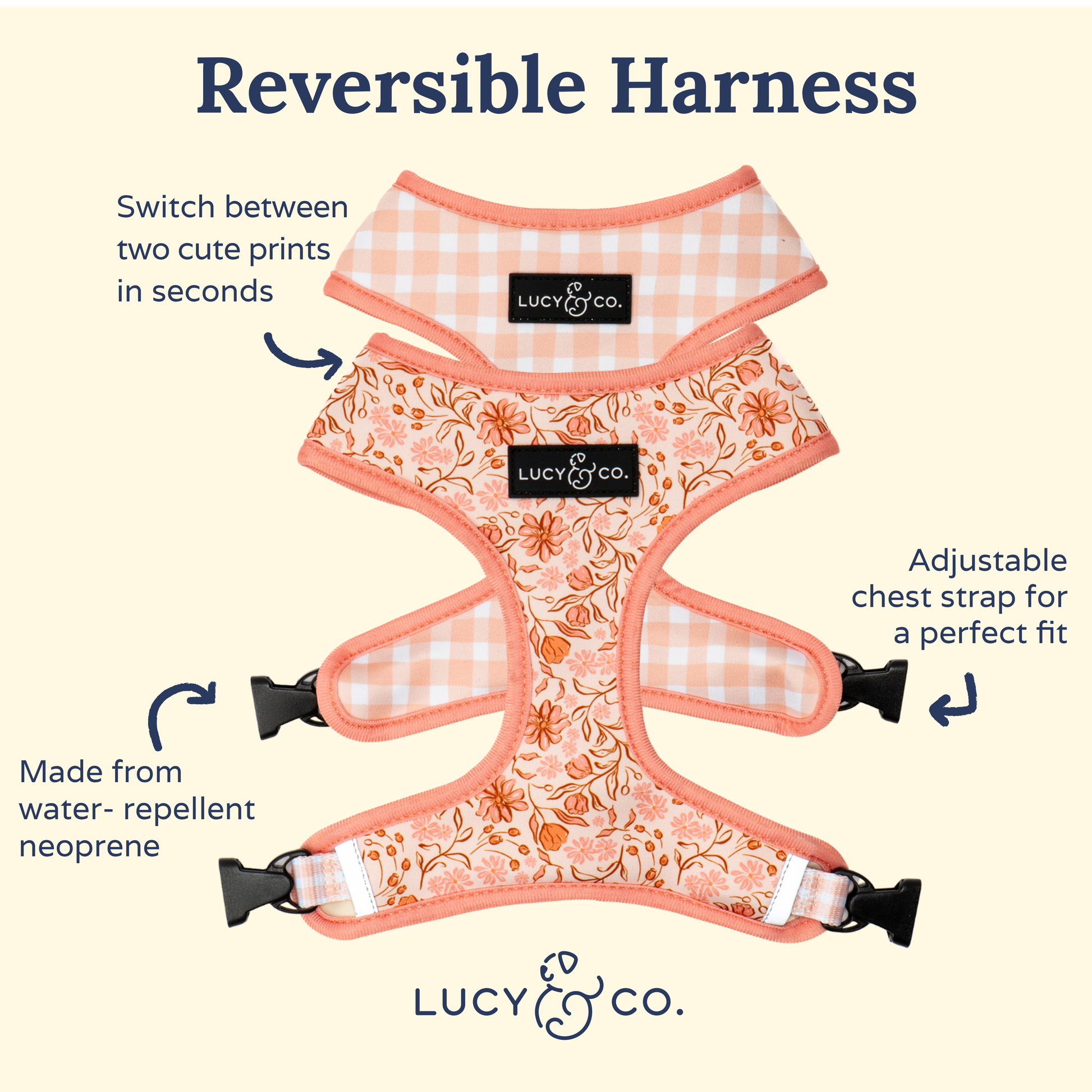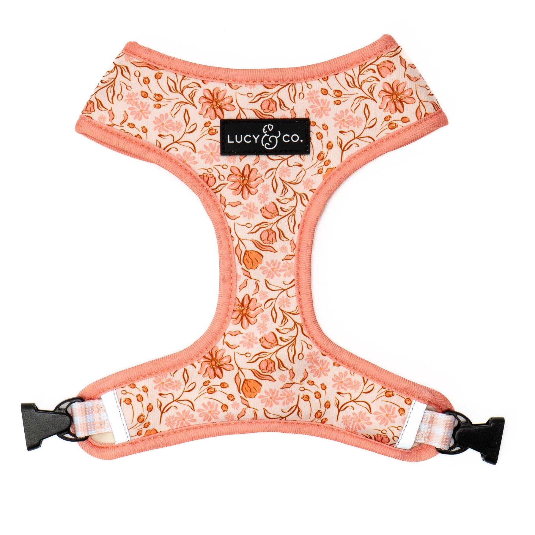 Let's take a walk among the Woodland Wildflowers! Made with water-repellant neoprene, this harness features two prints in one and it's easy to swap to the other side for a brand new look! Just push the D-ring strap through the ring and voila! Brand new fit! Explore our reversible harnesses for an easy-care for harness that moves with all of your pups natural wiggles and shakes.